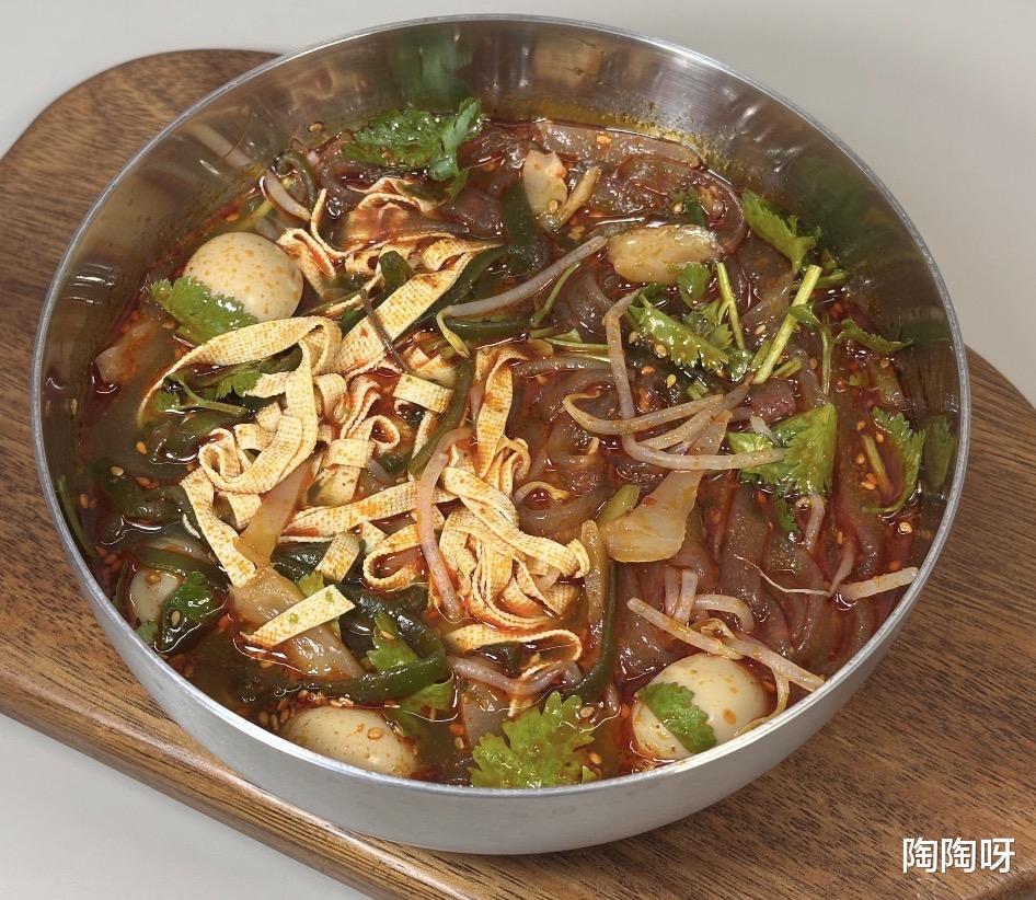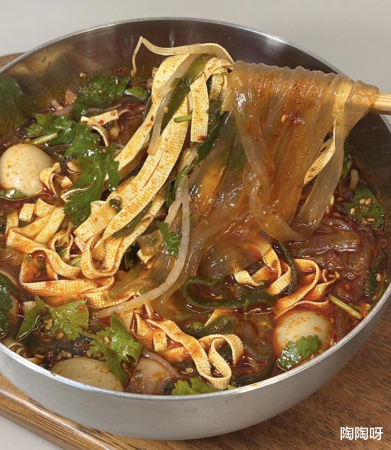 2. 放入豆芽,豆皮,海带丝,鹌鹑蛋烫熟,2-3分钟。