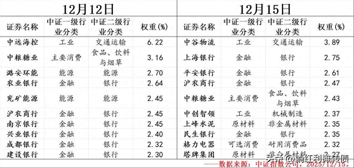 根据红利价值指数的编制规则,15日(12月的第二个星期五的下一交易日)是指数一年一度的样本调整生效日,根据中证指数公司之前公布的调样公告,本次样本调整共涉及19只样本,占据全部样本数量的38%,其实指数每次调样不仅涉及调入调出的样本,对没调出样本的权重也会重新进行赋权,每次样本调整后指数其实都会发生较大的变化,有的时候不啻于一只新指数。