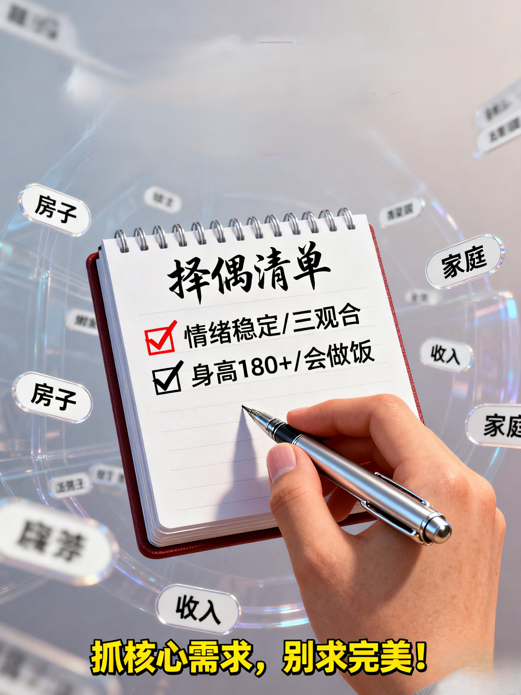 先搞清楚自己的核心需求,列个“择偶清单”出来。把那些能妥协的选项划掉,像什么“身高必须180+”“一定要会做饭”这类的。留下真正重要的核心需求,比如说“情绪稳定”“愿意沟通”。其实哪有完美的另一半啊,在“合适”的人里找让自己心动的,比在“心动”的人里找合适的要容易多了。婚姻是一场持久战,对方身上关键的品质可比一时的心动重要多了。