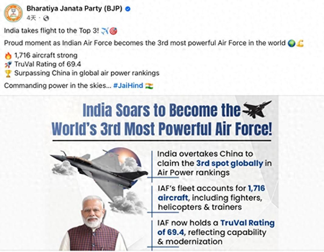 他们曾公布美国方面的一则全球空军排名,虽然在此排名当中印度并未占据第一,但由于名次超越了中国,印度也一度喜大普奔,连忙将排名发布在社交平台上大肆庆祝,却丝毫没有考虑这份排名存在诸多槽点,已经到了不切实际的程度: