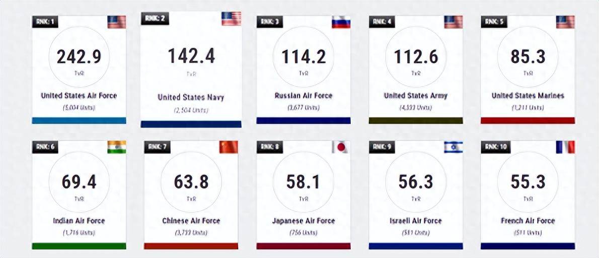 首先来看,美国军队被分为四类,美国空军,美国海军航空兵,美国陆军航空兵,美国海军陆战队航空兵各个榜上有名,且全部挤进榜单前五,相当于让美国一家独占近半名额。