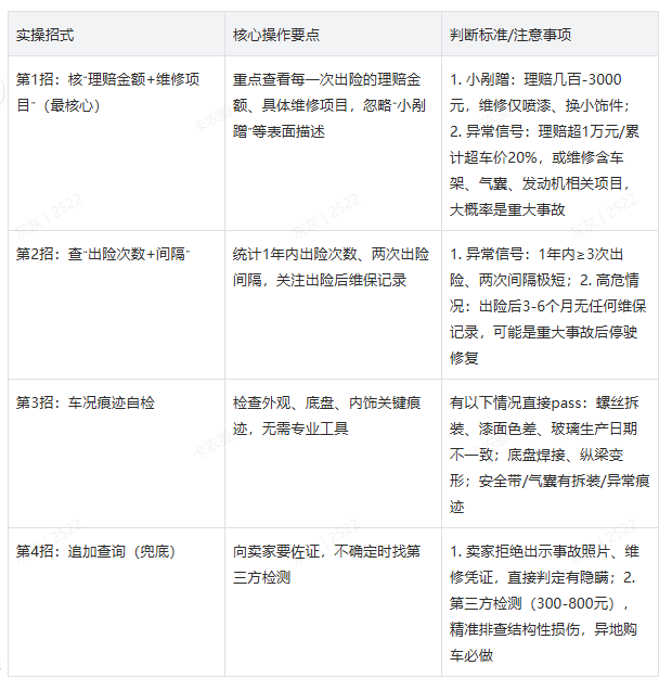 重点提醒:无论哪种渠道,只看“事故描述”=白查,一定要聚焦“理赔金额+维修项目”,这才是判断事故大小的核心,也是识破“小剐蹭”谎言的关键。
