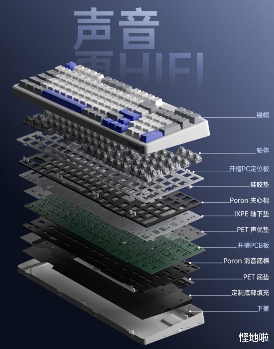 和主流旗舰客制化机械键盘一样,V700 DIY-98采用Gasket结构,但是堆料了包括硅胶垫、Poron夹心棉、IXPE轴下垫、PET声优垫、Poron消音底棉、PET底垫和定制底部填充共七层填充材质,遥遥领先绝大部分同等价位的产品。