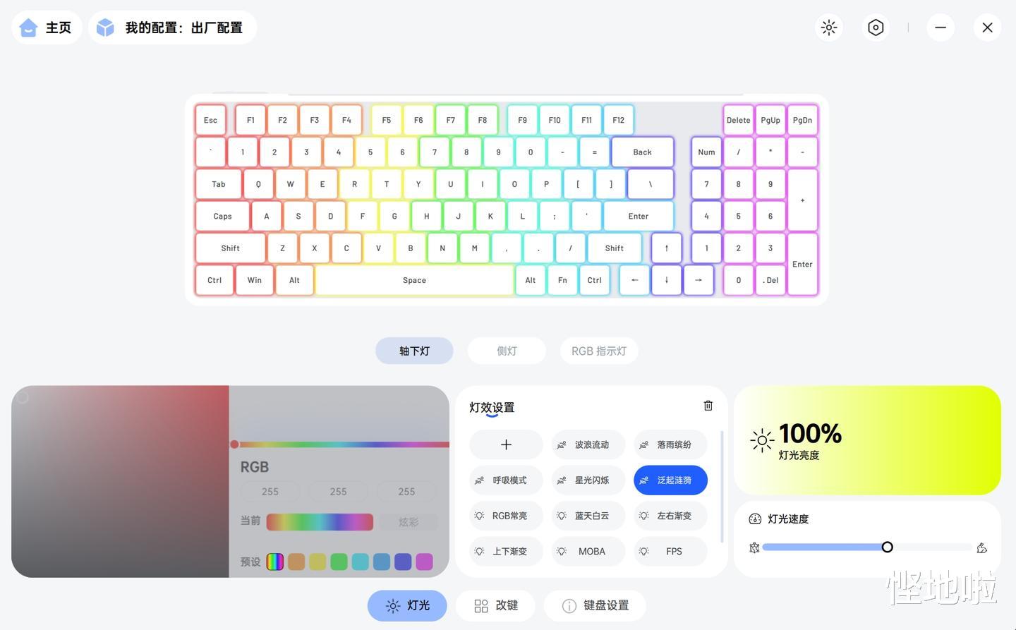 凯华定制的快银轴体能增强透光效果,按键的背光效果不错,在电竞房里必须是外设C位,当然用户也可以根据自己的喜好自定义调节背光亮度和模式。