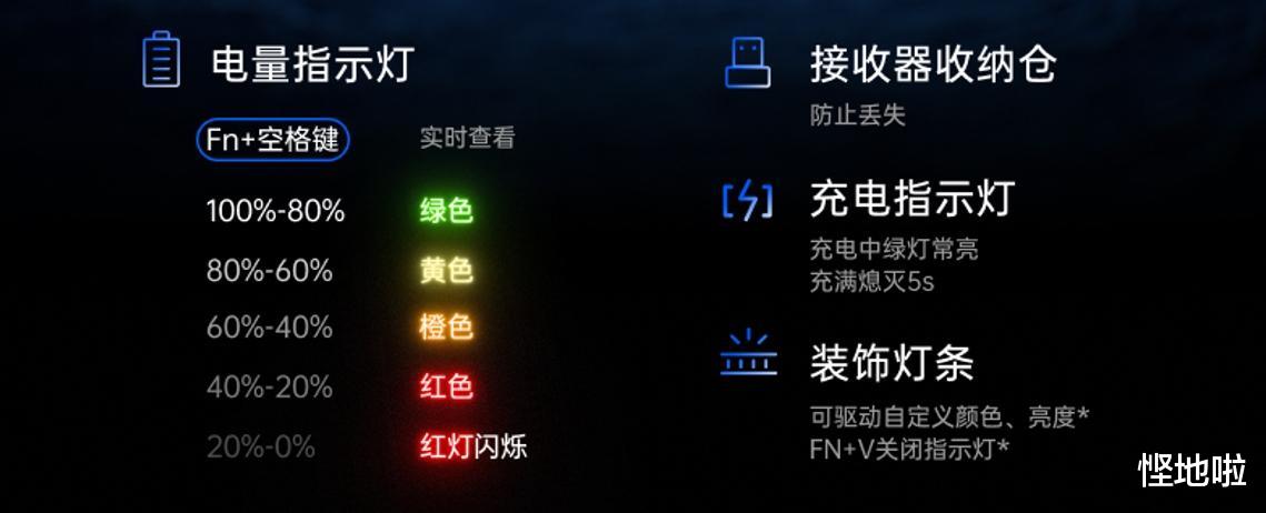 另外比较有创意的是,连接设备后,键盘的USB接收器收纳仓的装饰灯会常亮,用户可以通过指示灯快速判断键盘剩余电量。