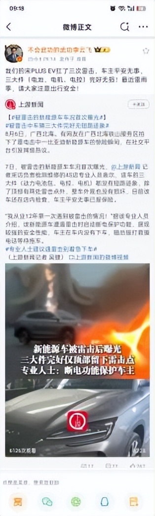 据比亚迪集团品牌及公关处总经理李云飞微博透露,核心部件零如电池、电机、电控三大件均完好无损。除顶部有两处雷击点,整车外观也没有损坏,在实际应用中展现出优异的安全性。