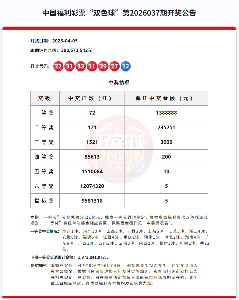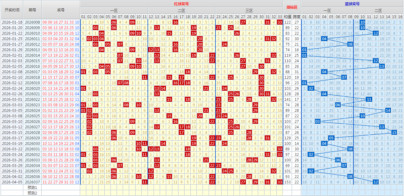 一、上期双色球第037期开奖号码(历史数据演示):