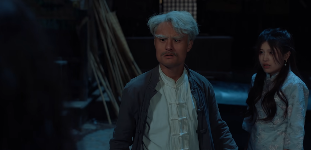 经典的一字眉造型,一看就是在山寨林正英,可全片就给大家画了一个平安符和法术有点关系,整部电影九叔就是一个动作高手,靠拳脚打人,什么铜钱剑桃木剑等等法器都没有了,不知道的还以为九叔是一个私家侦探呢!真的可以说蹭热度抄作业都不用心。