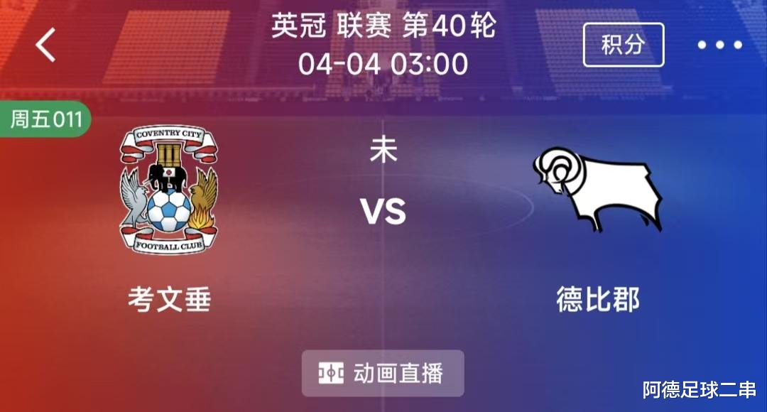 011英冠:考文垂VS德比郡 时间:2026-04-04 3:00 场地:考文垂建筑协会竞技场