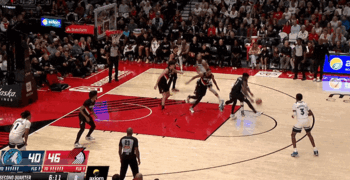 提上掩护吸引两人防守,阿夫迪亚长驱直入单臂劈扣