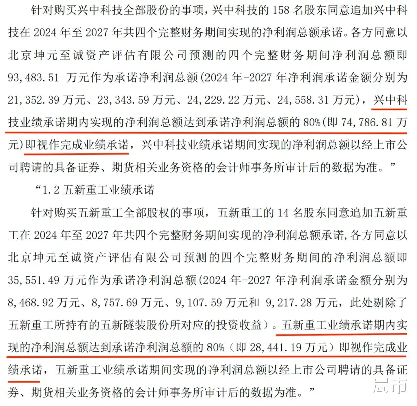 业绩承诺方面,兴中科技156名股东承诺2025年-2027年分别实现扣非净利润23,343.59万元、24,229.22万元、24,558.31万元,五新重工的14名股东承诺三年分别实现8,932.81万元、9,043.24万元、9,190.97万元扣非净利润。