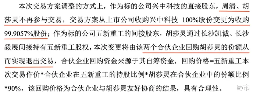 相关公告称,经上市公司与交易对方审慎决策,原交易对方周清、胡莎灵从交易中退出。周清、胡莎灵分别直接持有兴中科技0.0630%、0.0313%股份,胡莎灵还通过合伙企业长沙凯诚、长沙毅展间接持有五新重工0.0762%、0.2791%股权。二人合计持股比例极低。