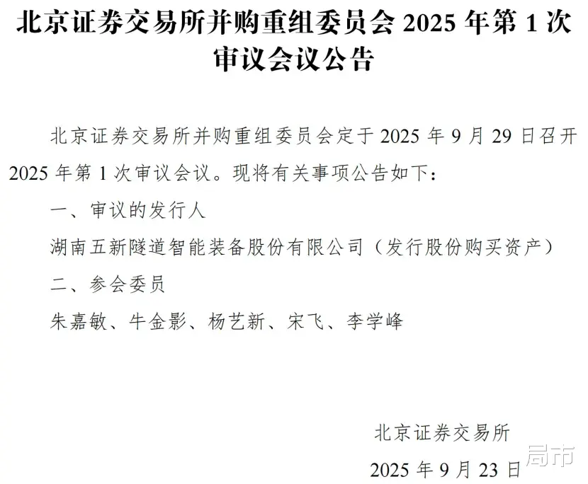 北交所并购重组委将于9月29日召开审议会议,对五新隧装(835174.BJ)发行股份购买资产事项进行审议。