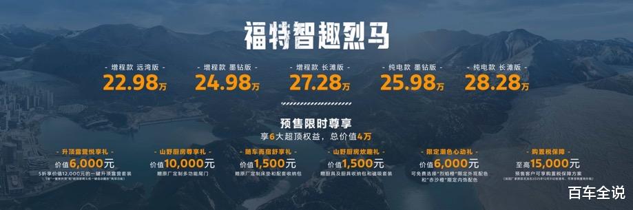 全球首款“全地形露营SUV”福特智趣烈马已正式开启预售,预售价22.98万起,预售期间可享总价值4万元的六大预售权益