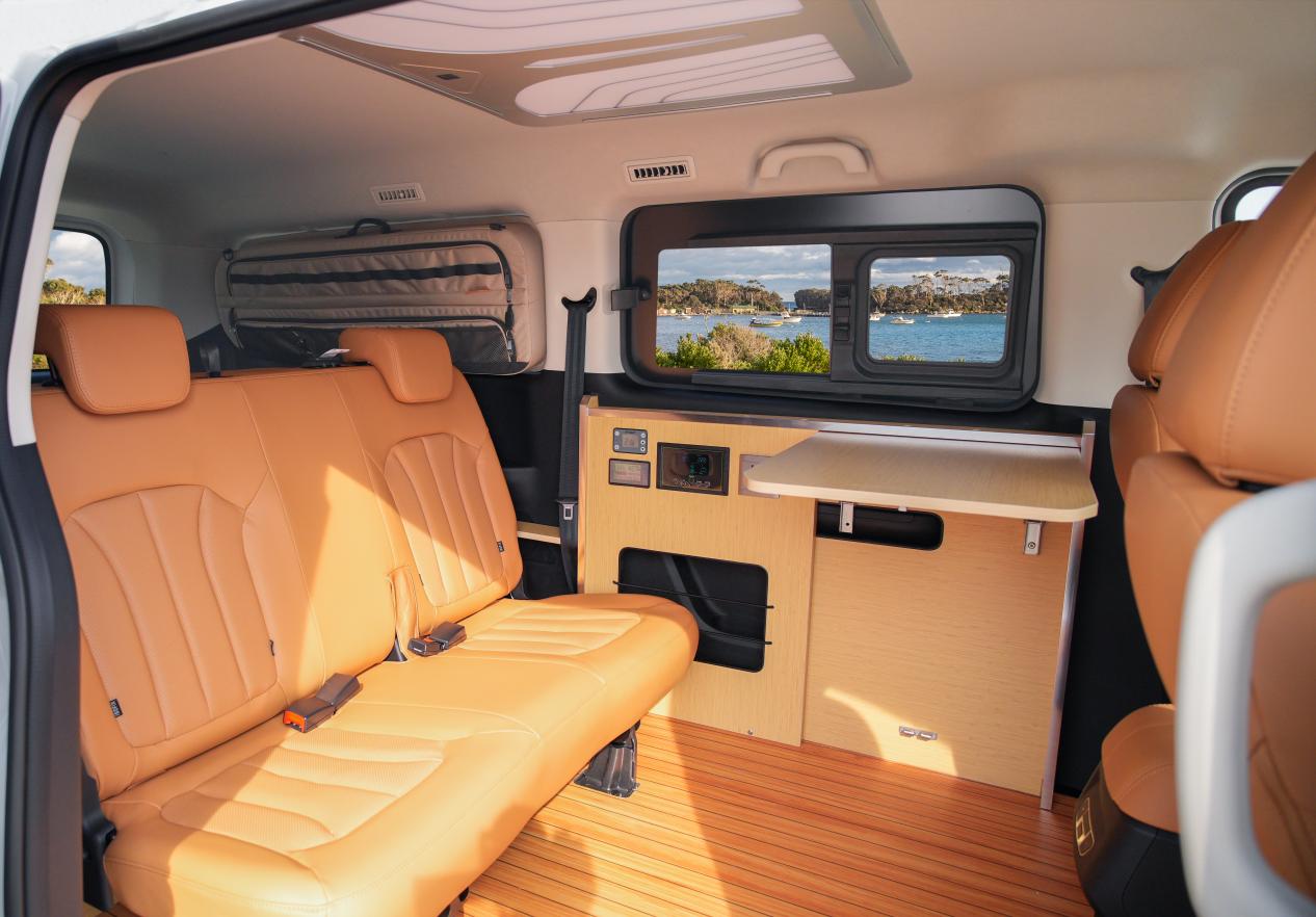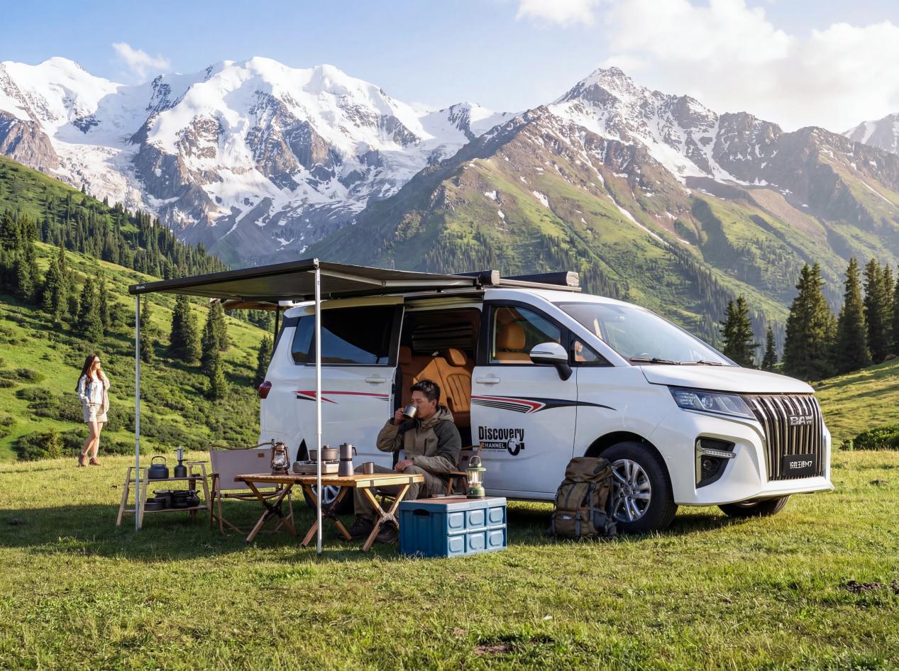 在日常便利与户外拓展方面,侧滑门设计方便上下车,后备箱储物充足满足购物与收纳需求;车顶平台与2500mm×3000mm黑胶边帐可快速拓展户外生活区,隐藏式折叠桌让野餐烹饪更加从容,轻松承载亲友欢聚的美好时光。