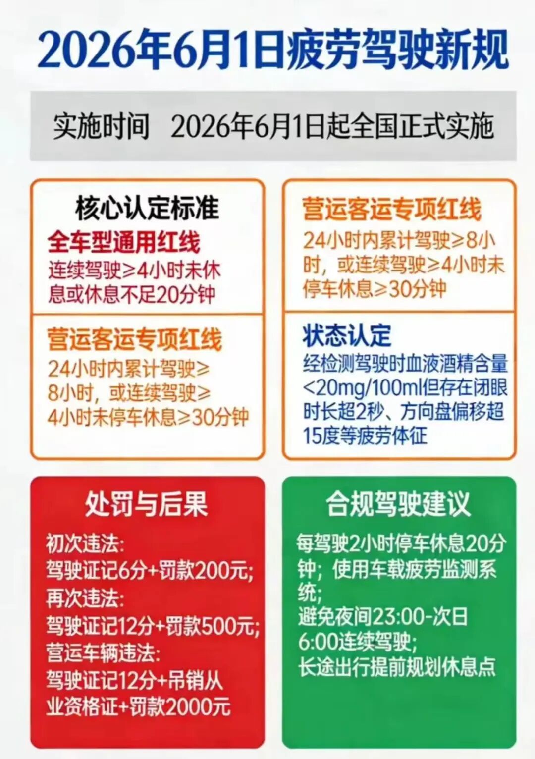 为了遏制网约车行业疲劳驾驶乱象,守护道路交通安全,2026年6月1日起,公安部正式实施新版疲劳驾驶认定规则,给网约车司机的驾驶时长划下了明确红线。新规不再单一以驾驶时长判定疲劳驾驶,而是采用时长、生理状态、生活轨迹三维判定标准,对网约车这类营运车辆的要求更是严苛——