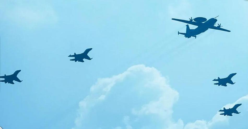 预警指挥机梯队由空警-500A、空警-600预警机,4架歼-16战机、4架歼-15T舰载机组成。
