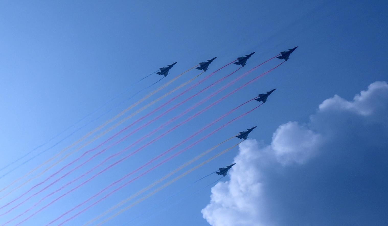 空军八一飞行表演队驾驶歼-10表演机,以超密集编队出场。7架战机在空中划出14道彩烟,寓意着中华民族14年可歌可泣的抗战历程,象征着14亿多中国人民奔向强国复兴的绚丽前景。