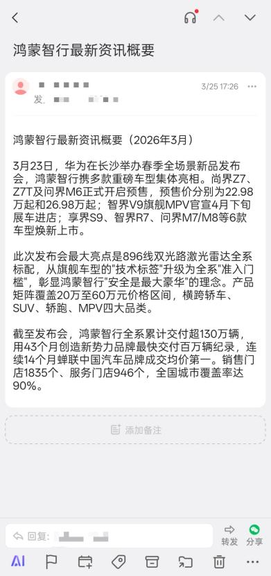 后来我想了解鸿蒙智行的最新动态,又懒得自己翻网页。我就让小艺Claw搜集最新资讯、整理成概要发我邮箱。没一会儿TA就告诉我搞定了,打开邮箱一看,销量成绩、新车发布这些关键信息全给概括好了,太牛了!