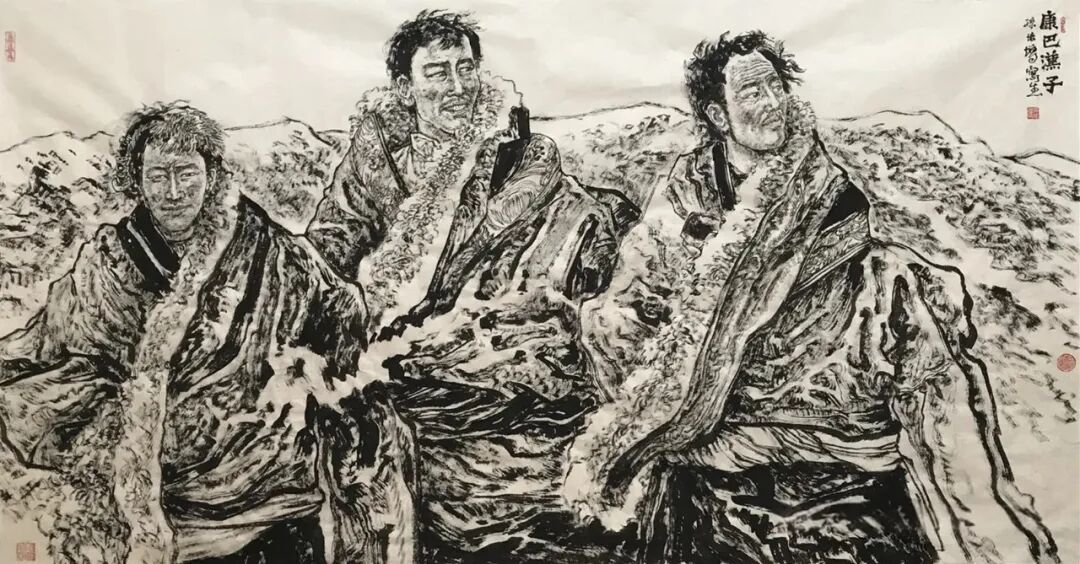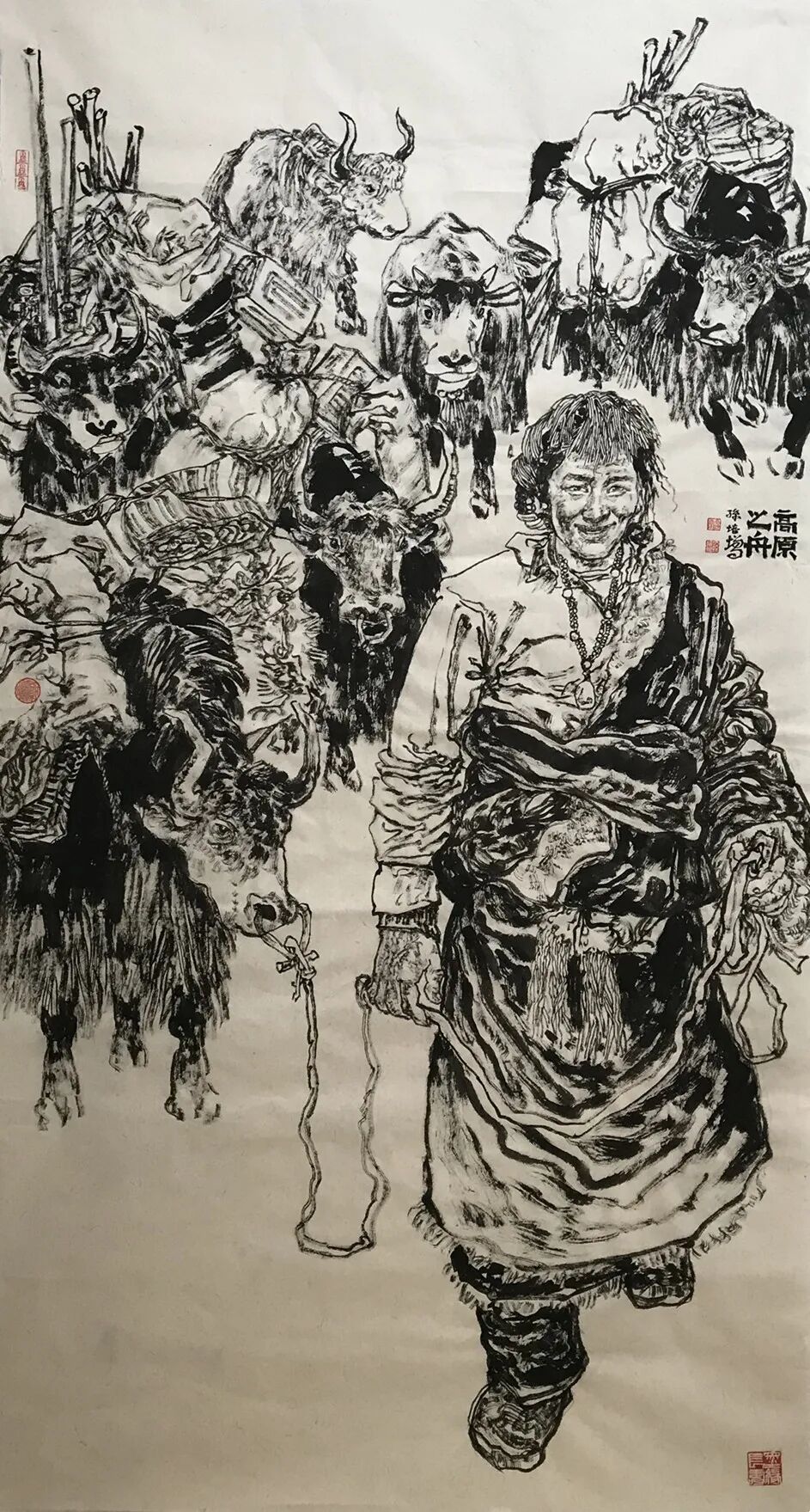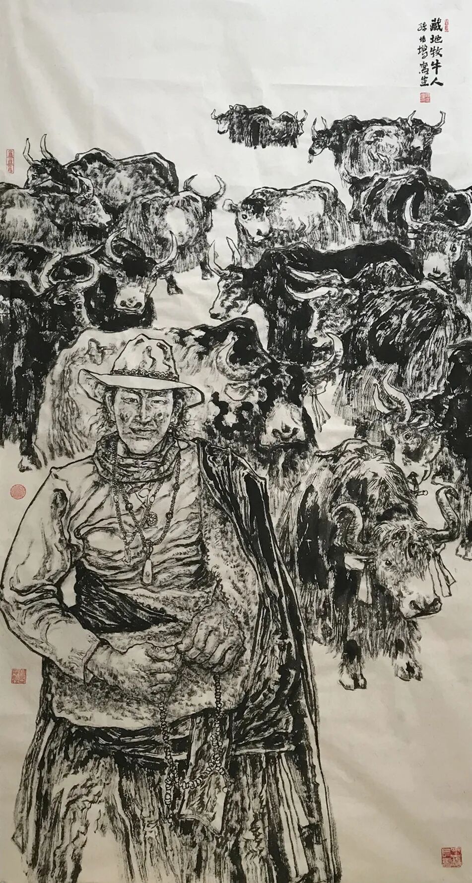 西藏是一个哲理与世俗并存的地方,藏民的日常生活是充满艰辛的,严酷的自然环境,长年的艰苦劳作,高原强烈的紫外线加上凛冽的寒风塑造了他们健硕的身躯和美丽的面容,他们的形象,迴异于城市中人,常常令画家感动的不能自持,那是一种没有任何矫饰的健康自然的美,我的画笔和镜头不停的记录着,总觉的不够,还不够,手中的笔太苍白,真的无法表现他们的美。于是我一次次的进入藏区,去感受那不同寻常的美,二十多年来,我跑遍藏甘青川各大藏区,搜集了大量的创作素材和资料。在画家的眼中西藏是一块凝结着自然,宗教和民族风情的神奇土地,虽然这里风景壮阔绝美,但我还是将更多的笔墨停留在对藏胞形象的描绘上,并通过塑造人物形象,来展示人物的生存状态和精神内涵,舍弃浮华和色彩,留下的是淳朴和厚重,我是习惯用毛笔写生的,毛笔的使用奠定了中国画书画同源的基础,中国画若失去了用毛笔写出的线,也就失去了他的特质,因此在我的创作中,线是主要的造型手段,在藏区的写生过程中,我发现用焦墨画的速写,比水墨和色彩,更具震撼力。所以我尝试用焦墨的形式表现西藏的人文风情,这样的作品不仅得到了专家的首肯,也得到了藏家的青睐,越是单纯的艺术,他的感染力更强,就像我们欣赏黑白照片,更有现实感和历史感一样,焦墨人物也同样具有独特的魅力。焦墨是中国画五笔七墨中的一墨,肇自远古彩陶,晋唐以降,焦墨技法得到了发展,至元人王蒙等偶作焦墨山水,引起画人注意,明代程遂纯以焦墨作画,独称于时,至近现代,黄宾虹,张仃浑厚华滋,浓郁厚重的山水画独树一帜,作为最古老也是难度最高的画法,历代人物画家鲜有涉足者,我早年追摹张仃先生焦墨山水画,对焦墨技法多有实践,今用雄强刚健的焦墨描绘藏地风情,颇觉得心手双畅之感,干涩粗旷的焦墨表现藏民的生产,生活,信仰的场景,体现出的是一种苍茫和浑厚,大气和苦涩的意境,这是水墨色彩所难以表达的,朴素之为美,天下莫能与之争。