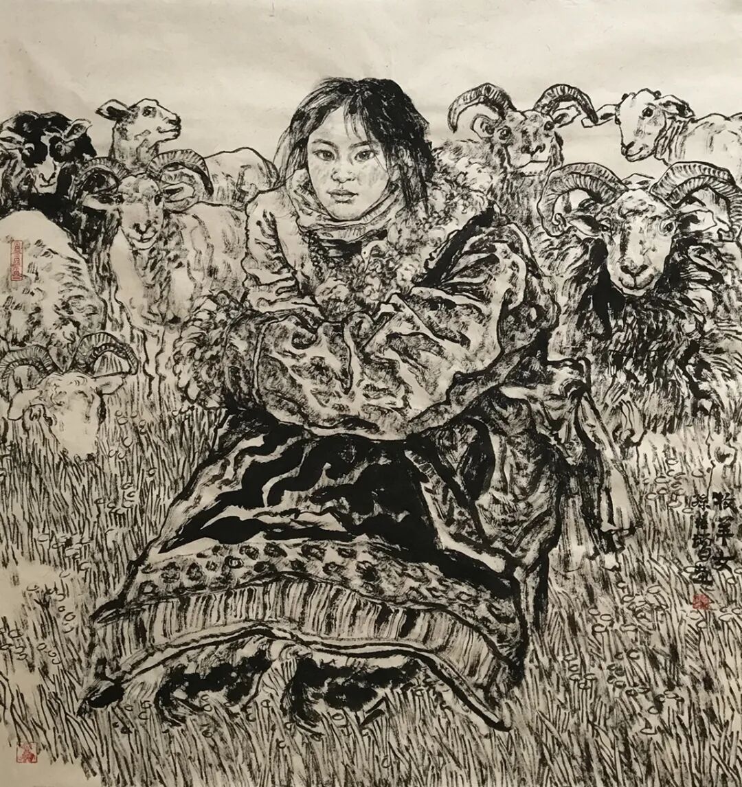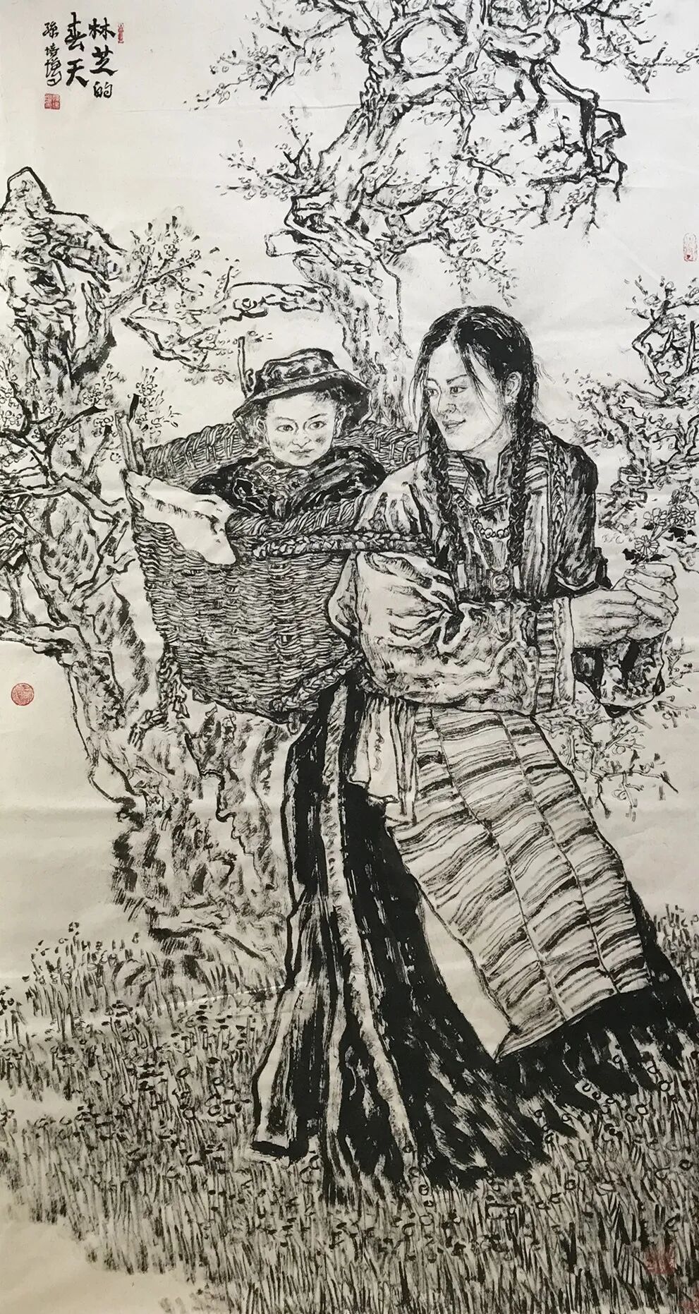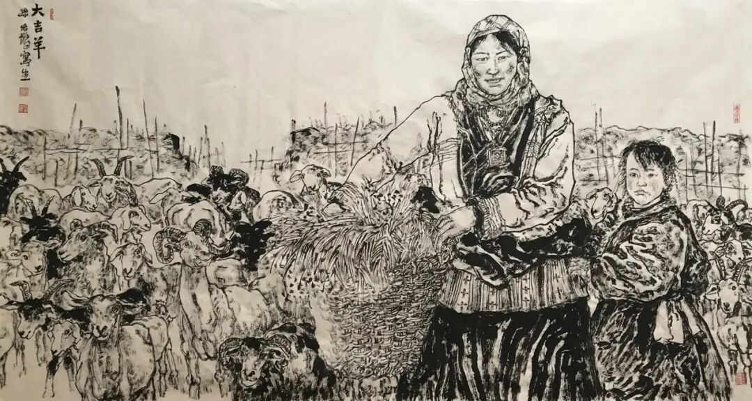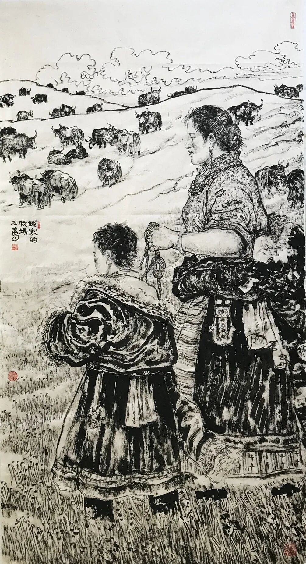 西藏是一个哲理与世俗并存的地方,藏民的日常生活是充满艰辛的,严酷的自然环境,长年的艰苦劳作,高原强烈的紫外线加上凛冽的寒风塑造了他们健硕的身躯和美丽的面容,他们的形象,迴异于城市中人,常常令画家感动的不能自持,那是一种没有任何矫饰的健康自然的美,我的画笔和镜头不停的记录着,总觉的不够,还不够,手中的笔太苍白,真的无法表现他们的美。于是我一次次的进入藏区,去感受那不同寻常的美,二十多年来,我跑遍藏甘青川各大藏区,搜集了大量的创作素材和资料。在画家的眼中西藏是一块凝结着自然,宗教和民族风情的神奇土地,虽然这里风景壮阔绝美,但我还是将更多的笔墨停留在对藏胞形象的描绘上,并通过塑造人物形象,来展示人物的生存状态和精神内涵,舍弃浮华和色彩,留下的是淳朴和厚重,我是习惯用毛笔写生的,毛笔的使用奠定了中国画书画同源的基础,中国画若失去了用毛笔写出的线,也就失去了他的特质,因此在我的创作中,线是主要的造型手段,在藏区的写生过程中,我发现用焦墨画的速写,比水墨和色彩,更具震撼力。所以我尝试用焦墨的形式表现西藏的人文风情,这样的作品不仅得到了专家的首肯,也得到了藏家的青睐,越是单纯的艺术,他的感染力更强,就像我们欣赏黑白照片,更有现实感和历史感一样,焦墨人物也同样具有独特的魅力。焦墨是中国画五笔七墨中的一墨,肇自远古彩陶,晋唐以降,焦墨技法得到了发展,至元人王蒙等偶作焦墨山水,引起画人注意,明代程遂纯以焦墨作画,独称于时,至近现代,黄宾虹,张仃浑厚华滋,浓郁厚重的山水画独树一帜,作为最古老也是难度最高的画法,历代人物画家鲜有涉足者,我早年追摹张仃先生焦墨山水画,对焦墨技法多有实践,今用雄强刚健的焦墨描绘藏地风情,颇觉得心手双畅之感,干涩粗旷的焦墨表现藏民的生产,生活,信仰的场景,体现出的是一种苍茫和浑厚,大气和苦涩的意境,这是水墨色彩所难以表达的,朴素之为美,天下莫能与之争。