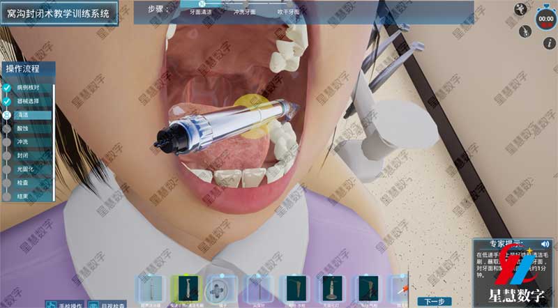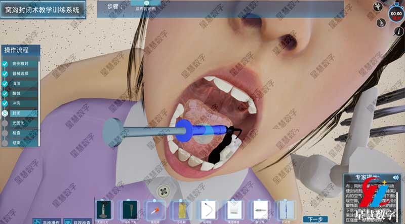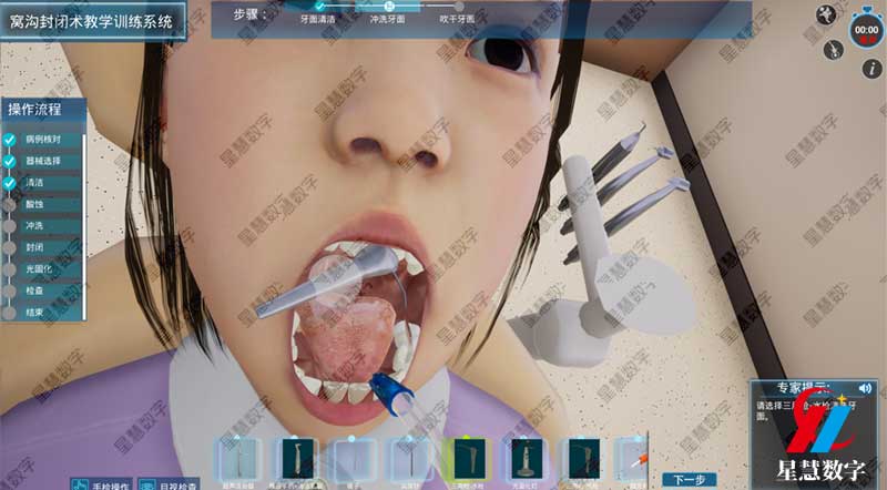 窝沟封闭术教学训练系统并不是简单的动画演示,而是基于严谨的医学数据构建的专业培训工具。通过高精度的3D建模技术,平台能够还原出牙齿表面的点隙裂沟形态,让学生在虚拟环境中能够清晰地观察到不易清理的隐蔽区域。在进行窝沟封闭术教学时,学员可在PC端或佩戴VR设备,在系统引导下一步步完成清洁牙面、酸蚀、冲洗和涂布封闭剂等全流程操作。