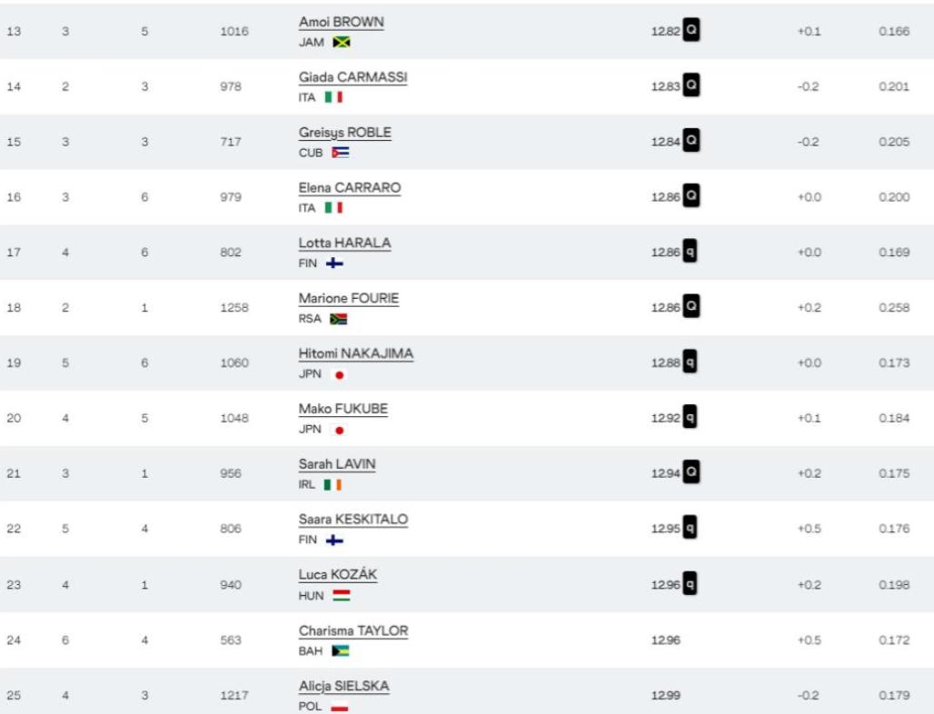 第四组预赛中,芬兰华裔选手莎拉以12秒95的出色表现挤掉田中佑美,晋级小q名单。 日本选手福部真子在第五组以12秒92排名小组第四,巩固了晋级资格。 最终,小q第六名的成绩为12秒96,而吴艳妮本赛季最佳成绩恰好为此,今日未能发挥正常水平。