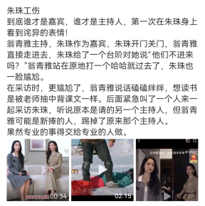 网友总结了翁青雅的翻车名场面:抢进门、占 C 位、提问卡壳,问题还没深度,翻来覆去就夸朱珠长得美。