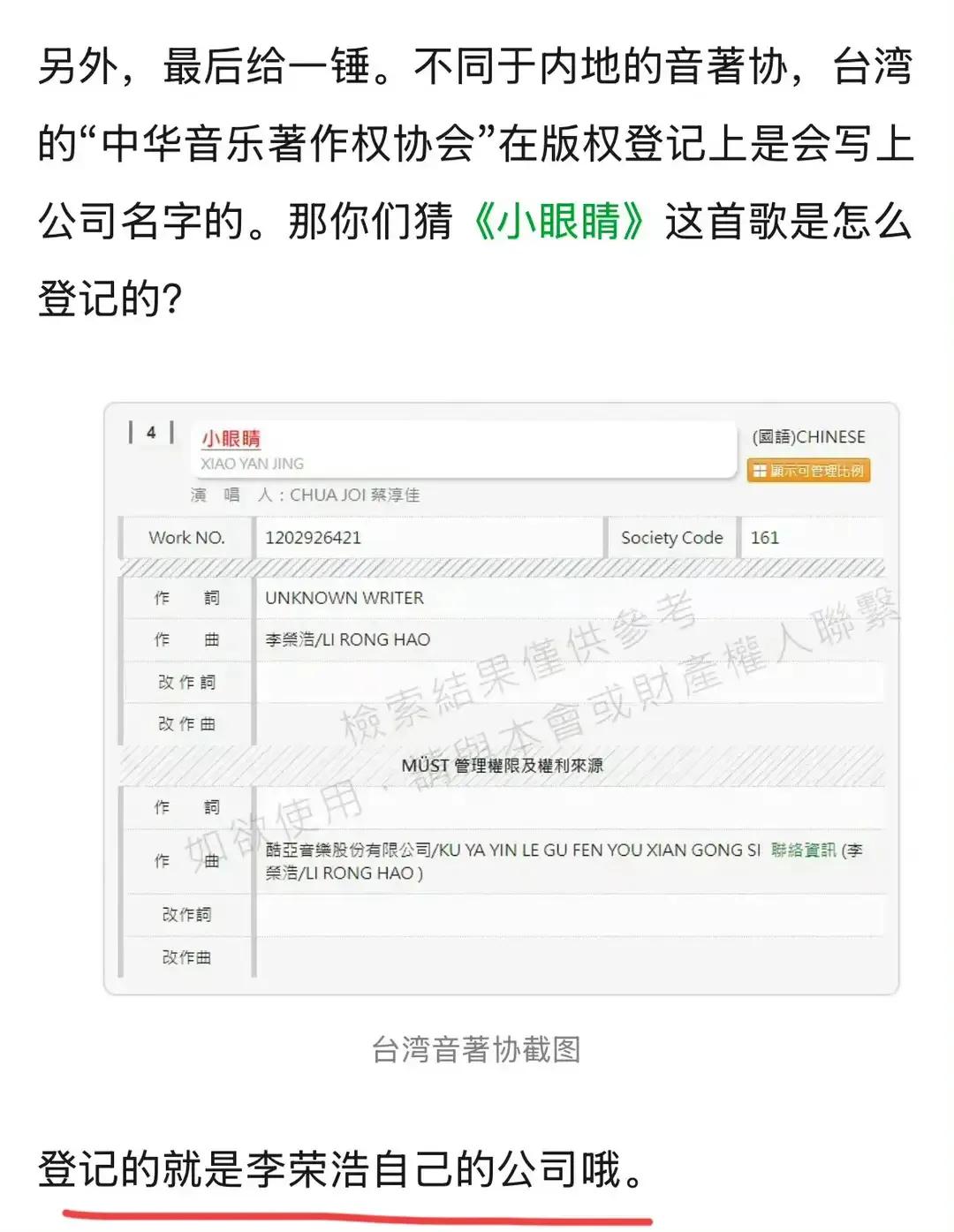 而对于《小眼睛》这首歌目前到底是不是登记在李荣浩的公司名下,对方也要他明确解释。