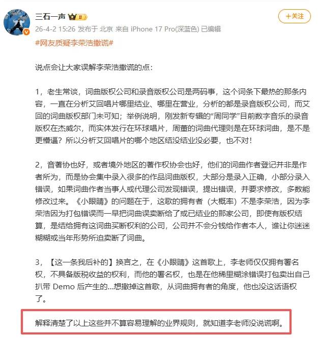 三石一声则公开站在李荣浩这边,认为李荣浩其实并没有撒谎。