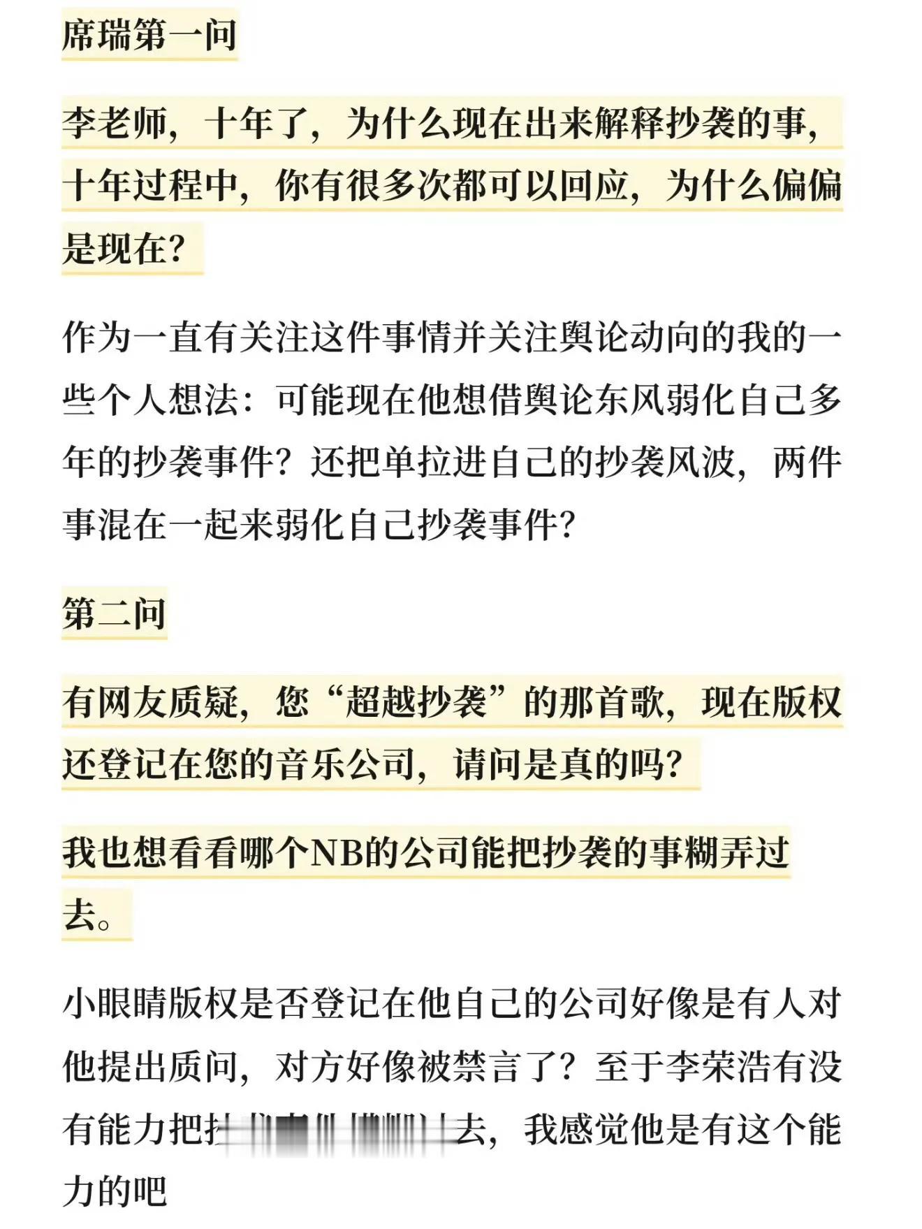 李荣浩所谓抄袭事件已在网络流传有10年之久,也因此席瑞质问他为何不早点出面解释清楚。