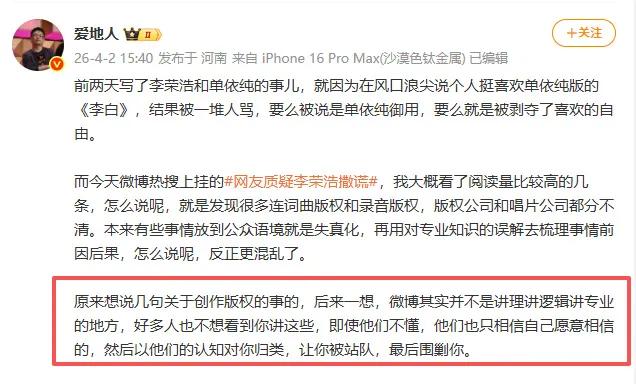 在李荣浩对于版权事件在网络上持续发酵时,他站出来公开质疑对方。