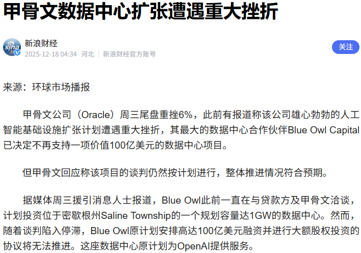 一个约100亿美元、约1GW级别的数据中心项目融资谈判遇阻,核心资金方被曝退出/谈判停滞,引发市场对其AI基建扩张可持续性的担忧……这事咱们分析过了,市场就是担心,你一个云服务商,搞基建到底行不行?就算行,什么时候能搞明白……