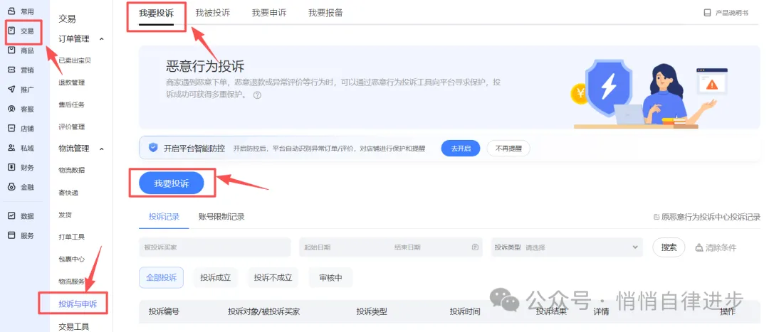 三是投诉路径1:电脑端后台——交易——投诉与申诉——我要投诉