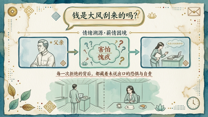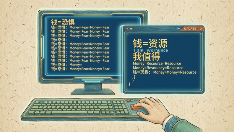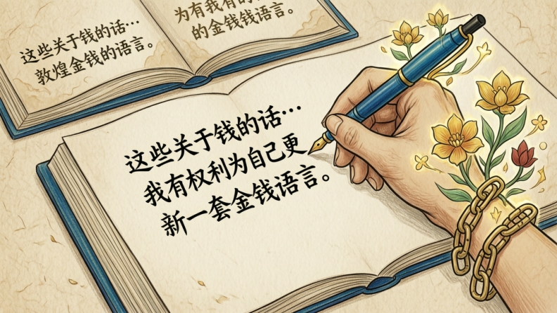 我们这一代要做的,不是简单地否定他们,而是接过这一套“旧版本的金钱代码”,看一眼,然后做一个新的选择:哪些部分,我已经长大到可以更新了?哪些话,我可以礼貌地放回给上一代,而不再让它支配我的一生?要做到这点,第一步就是:把那些“已经混在内心里的声音”从你的自我感觉中分离出来——知道:“哦,这句话不是‘我的真心’,它只是我小时候听多了的一句金钱咒语。”当你能这样看,你和钱之间就不再是“命中注定的模式”,而是可以被重新书写的关系。