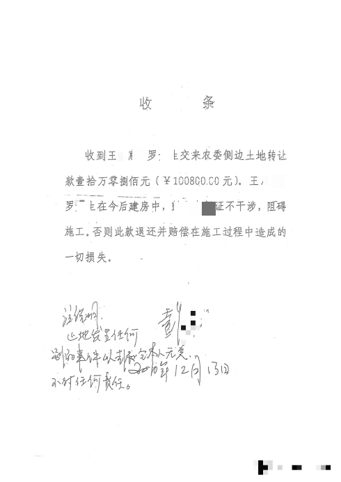 仅三天后,李某蓉又主导签订三方补充协议,将补偿款书面调整为27万元,刻意将星光村南门组列为丙方,明确其负责土地交付,乙方需从中支付15万元给丙方,同时约定建房期间除何某明外的群众闹事由乙、丙方处理,否则需退还27万元并赔偿损失——此举实质是拉拢村、组为其非法转让集体土地的行为“打掩护”。但关键事实是,罗先生实际支付的补偿款为37.08万元,因其中一人不愿意在协议书签字,但收取了100800土地转让款。