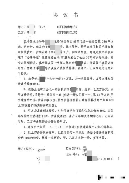 2010年12月,时任惠水县某单位领导的李某蓉与罗先生、王某惠签订《协议书》,核心约定直指集体土地非法转让:将惠水县和平镇星光村南门组330平方米集体机动田转让给二人开发建房。协议明确:罗先生需支付37万元补偿款,房屋建成后需以每平方米600元低价,向李某蓉出售门面1个、住房1套,房屋建至三楼后李某蓉支付50%房款,剩余款项待产权证办理完毕后付清,违约方需赔偿造房总面积总价的50%。