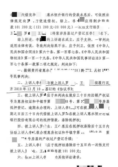 2021年,李某蓉上诉后,黔南州中院未全面核查证据,违背“无效合同自始没有法律约束力”的法律原则,作出(2021)黔民终号判决,撤销一审结果,判令罗先生继续履行非法协议,要求罗浩30日内注销房屋抵押登记,逾期则李某蓉可代偿924557.41元贷款涤除抵押权,罗先生需协助过户,李某蓉支付剩余购房款101200元。