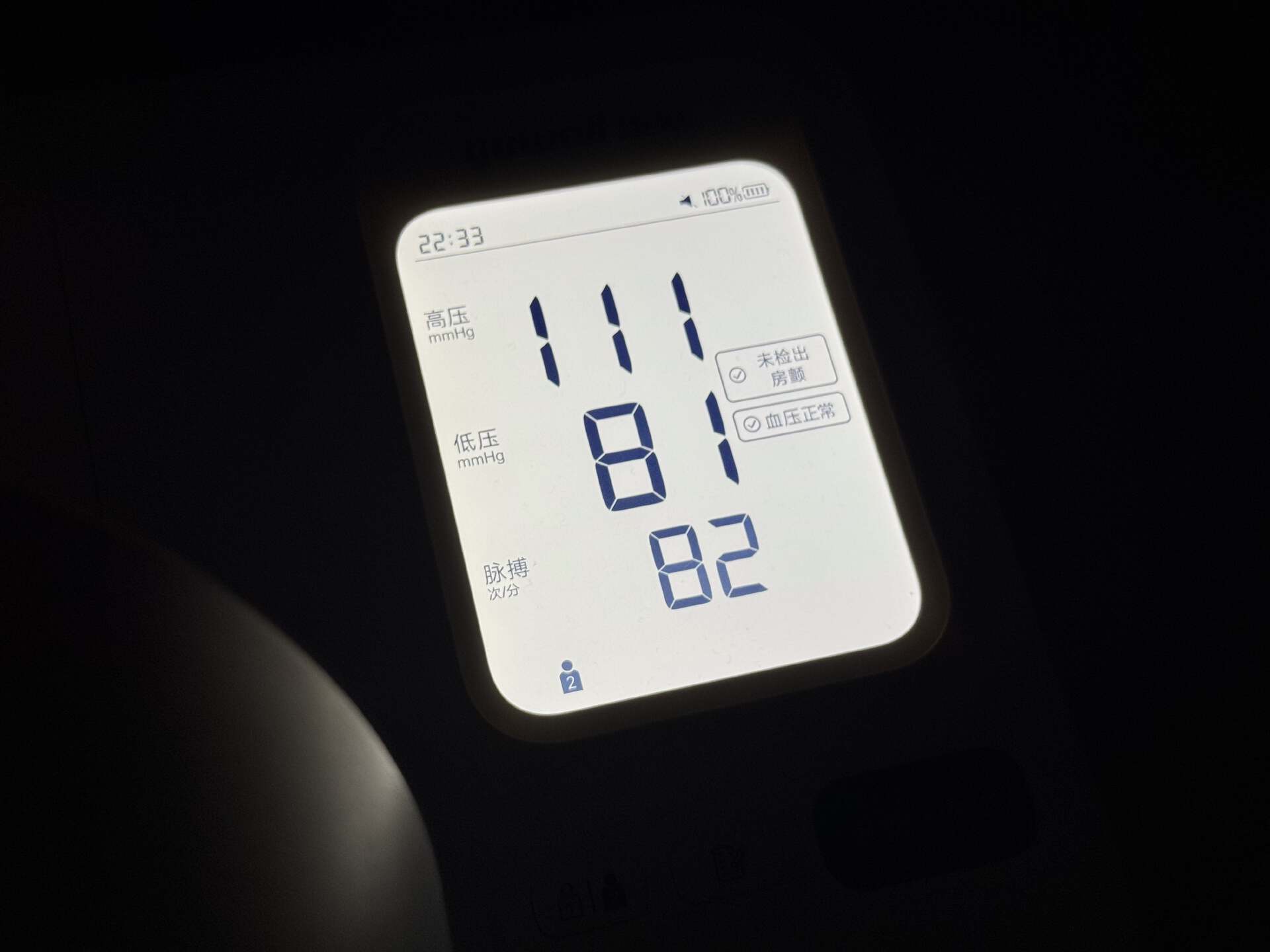 这里要特别说一下它主动发光的背光大屏,能提供清晰、均匀、柔和的背景光,显著提升数字与文字的对比度。即使在清晨、夜晚或室内光线不足时,数字也仿佛“浮”在屏幕上,一目了然,老人无需眯眼或寻找特定角度,极大降低了因视力问题导致的阅读困难。下图是婉儿在深夜熄灯环境下用手机直出的血压计屏幕,一整个直观清晰,极好辨认。