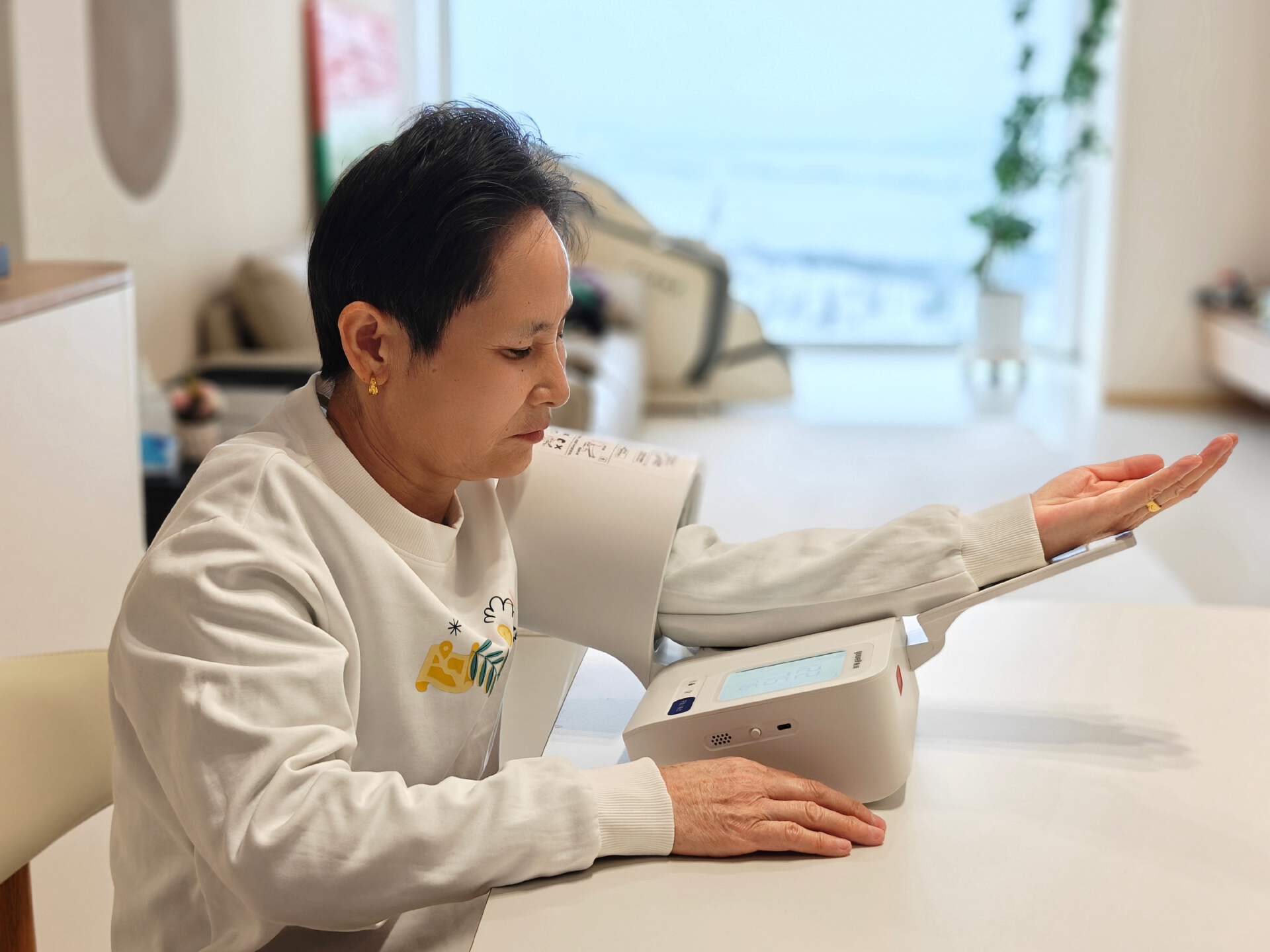 “如今,那个白色臂筒安静地放在客厅茶几上,像一位随时待命的家庭健康管家。老妈不再需要完成‘手部体操’独立就能轻松完成测量,也不再为看不清数字而皱眉。她获得的不只是一组组准确的数据,更是一种轻松掌控自身健康的从容,和一份不必事事依赖老爸/子女的底气。