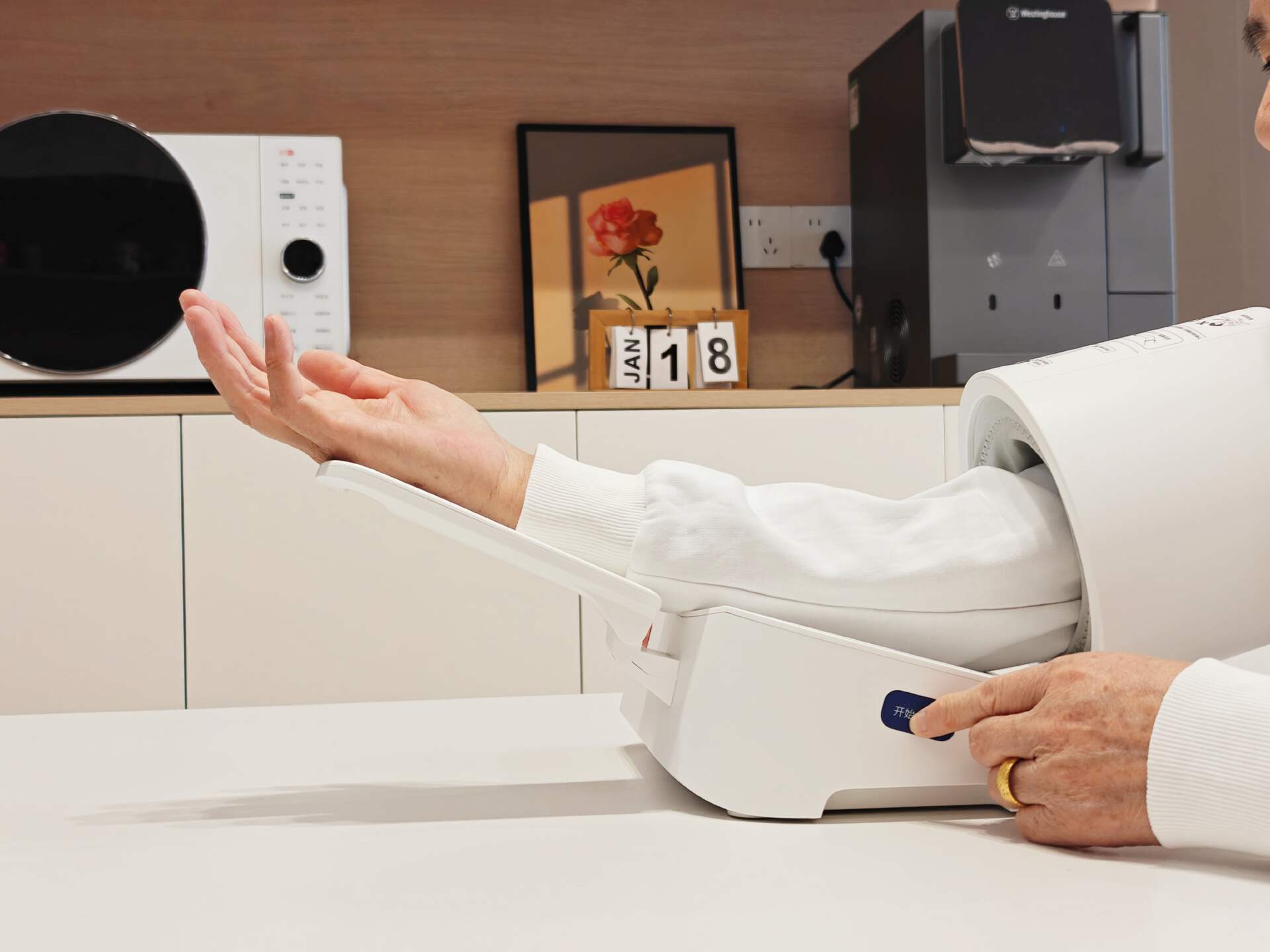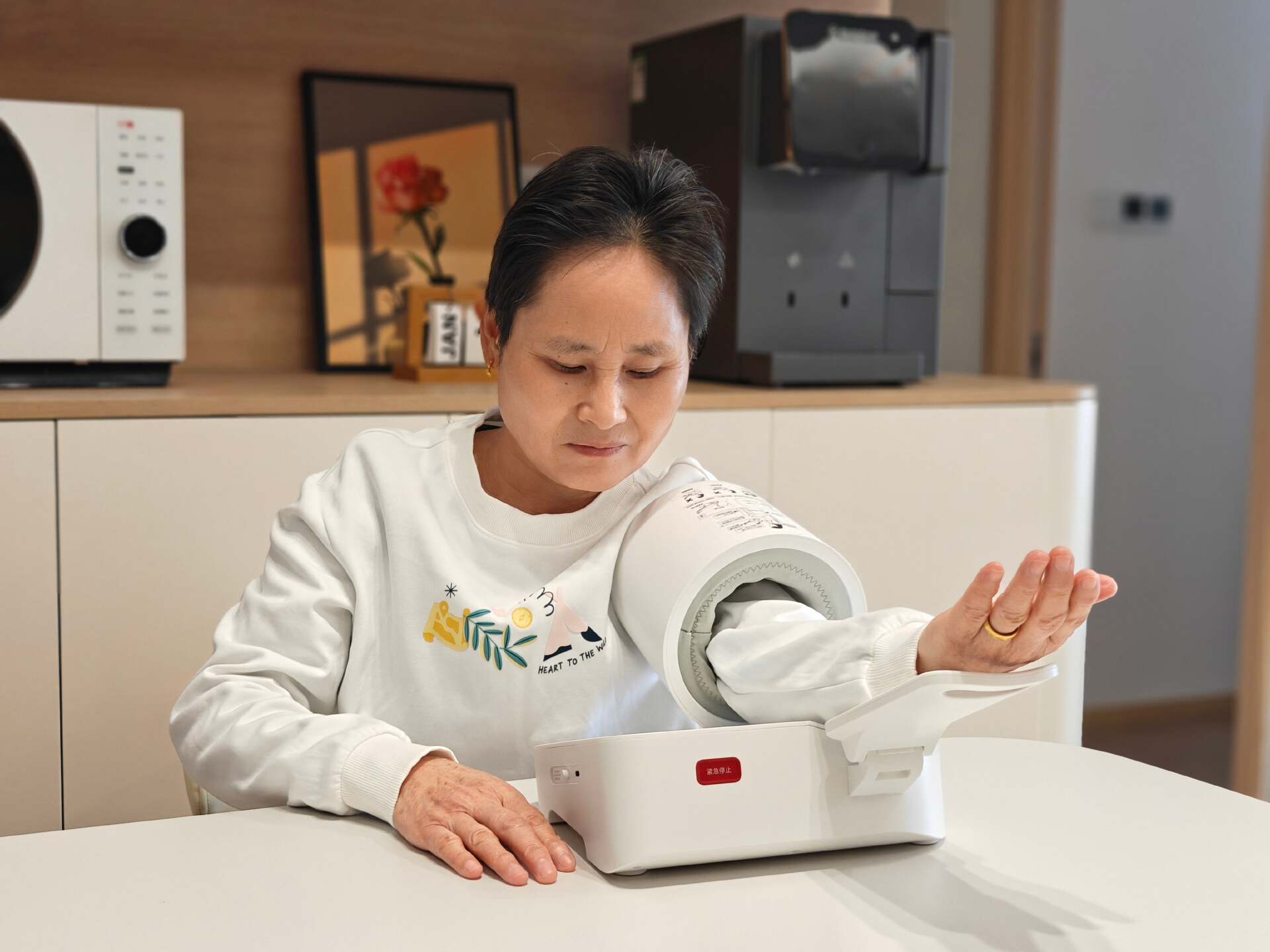 过去,每次给老妈测量血压,都少不了一番小心翼翼的“配合”。老妈得坐得端端正正,老爸则在一旁当“技术员”:绑袖带、定位动脉、手动充气、缓慢放气……一套流程下来,两人都挺紧张。现在,老妈只用打开臂筒&臂托,自然放入手臂,按下开始按键就能快速获得血压数据了,整个过程简单丝滑。从此,量血压从一项需要两人协作的“家庭事务”,变成了老妈伸手就能完成的日常小事。