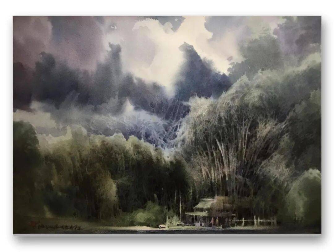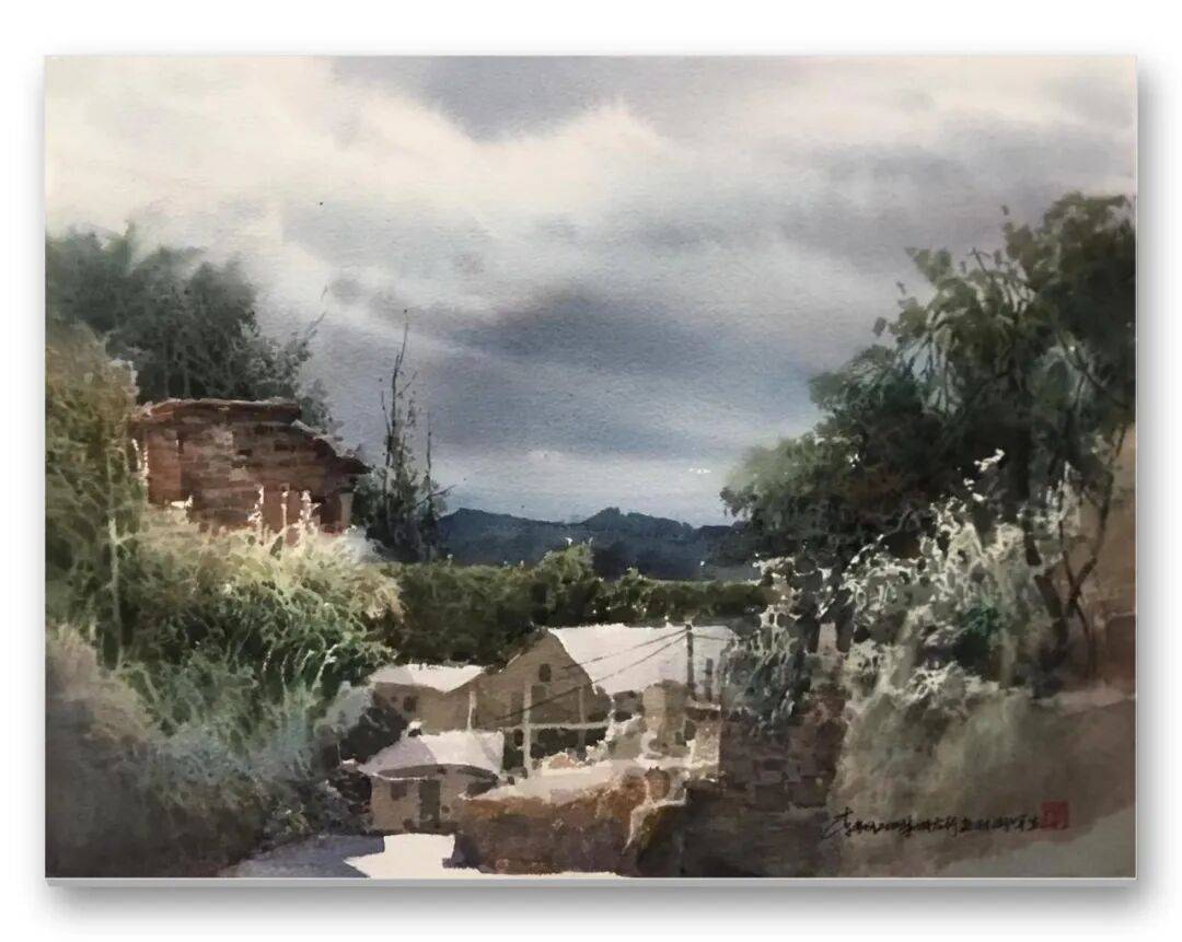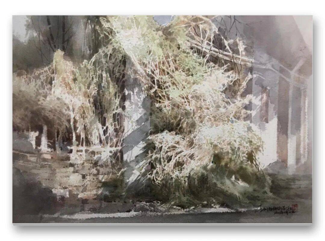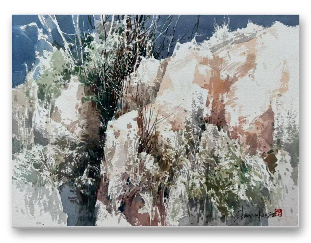 画品即人品,先生的笔墨间,处处叠印着他的人生底色——开朗豁达的胸襟、饱经岁月的厚重,化作凝重含蓄的色块;诗人般的敏锐、山民般的淳朴,凝为灵动婉转的线条。儒家的坚毅进取与老庄的淡虚沉静,在他的画中悄然相融:一笔一画的果敢,是入世的担当;水色漫漶的随性,是出世的从容。这种精神内核,让他的意象水彩探索走出了独树一帜的道路,所谓“舍近求远”,实则是不随流俗、深耕本心的坚守,最终成就了新水彩的新品质。