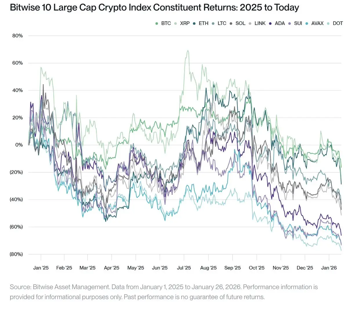 ETF 和 DAT 资金流动掩盖了2025年的寒冬仔细观察这张自2025年1月1日起Bitwise 10大市值加密货币指数成分股的图表。