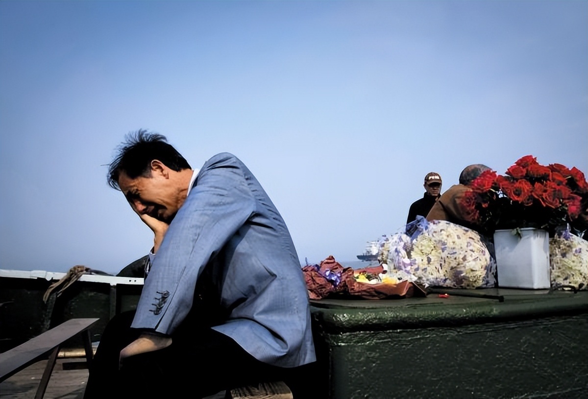 白菊花一朵一朵落入水中,纸鹤一只一只放入海面,王兆兰站在船舷边。周围的人在哭,在烧纸,在念叨着什么,她一直没出声。