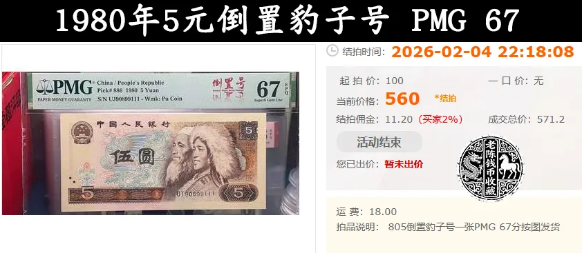 不过那些号码有一点特殊的80年5元纸币,值个几百元还是可以的。就比如上面这张80年5元纸币,就在26年2月4号的晚上,以571.2元被拍出。