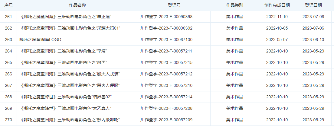 首先是著作权的登记。出品方对电影中出现的数百个角色和其衍生形态、道具都进行了全面的著作权登记,包括主要角色如哪吒、敖丙、配角如龙王、殷夫人、石矶娘娘、土拨鼠、弱视老人、乐师等和道具。除此之外,哪吒的电影剧本以及特效代码等也进行了专门的著作权登记。