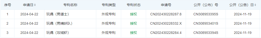 然后是专利申请。为防止未经授权的周边产品出现,出品方为角色周边产品申请了外观专利,涵盖玩偶、盲盒等商品。