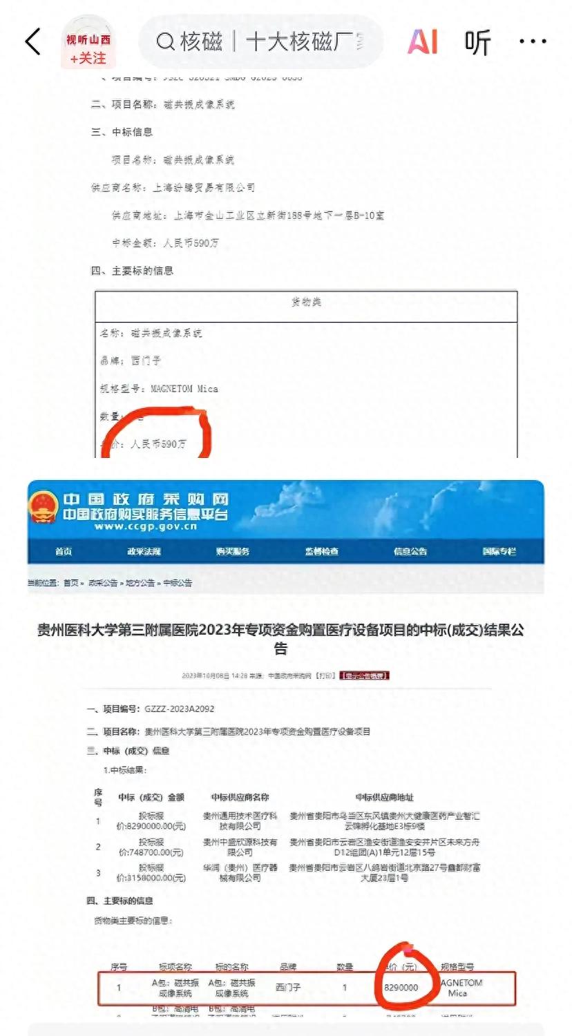 近日!在中国政府采购网的公开公告中,一组数据令人瞩目:2023年,江苏丰县中医医院采购的西门子MAGNETOM Mica磁共振成像系统,中标价为590万元;而短短四个月后,贵州医科大学第三附属医院采购的同款设备,中标价却高达829万元,两者价差达239万元,相当于一套中小型医疗设备的全款。同款同规格设备,为何在不同省份呈现如此悬殊的价格差异?这一问题不仅牵动着公众对公共资金使用效率的关切,更直指医疗设备采购领域的透明化痛点。