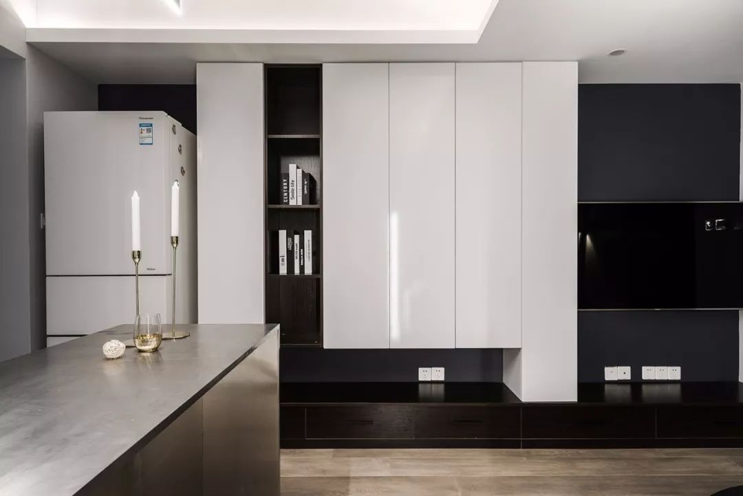 冰箱紧挨着到顶定制柜,柜体中间预留部分空位(方便放常用物品),还嵌入了开放式书架;底部抽屉柜一路延伸至客厅,直接充当电视柜使用,既能收纳杂物,又能摆放电视,储物空间丰富且不占额外面积。