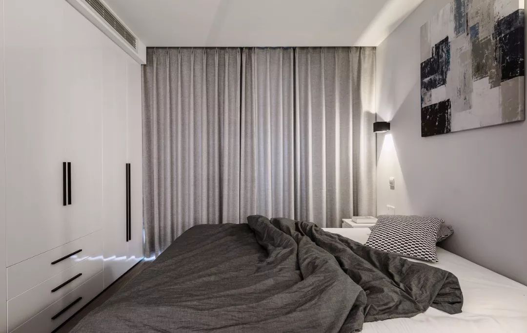 卧室以浅灰色为主调:左右两侧挂浅灰色窗帘,搭配同色系床品,简约又有格调,睡眠氛围更显沉静;